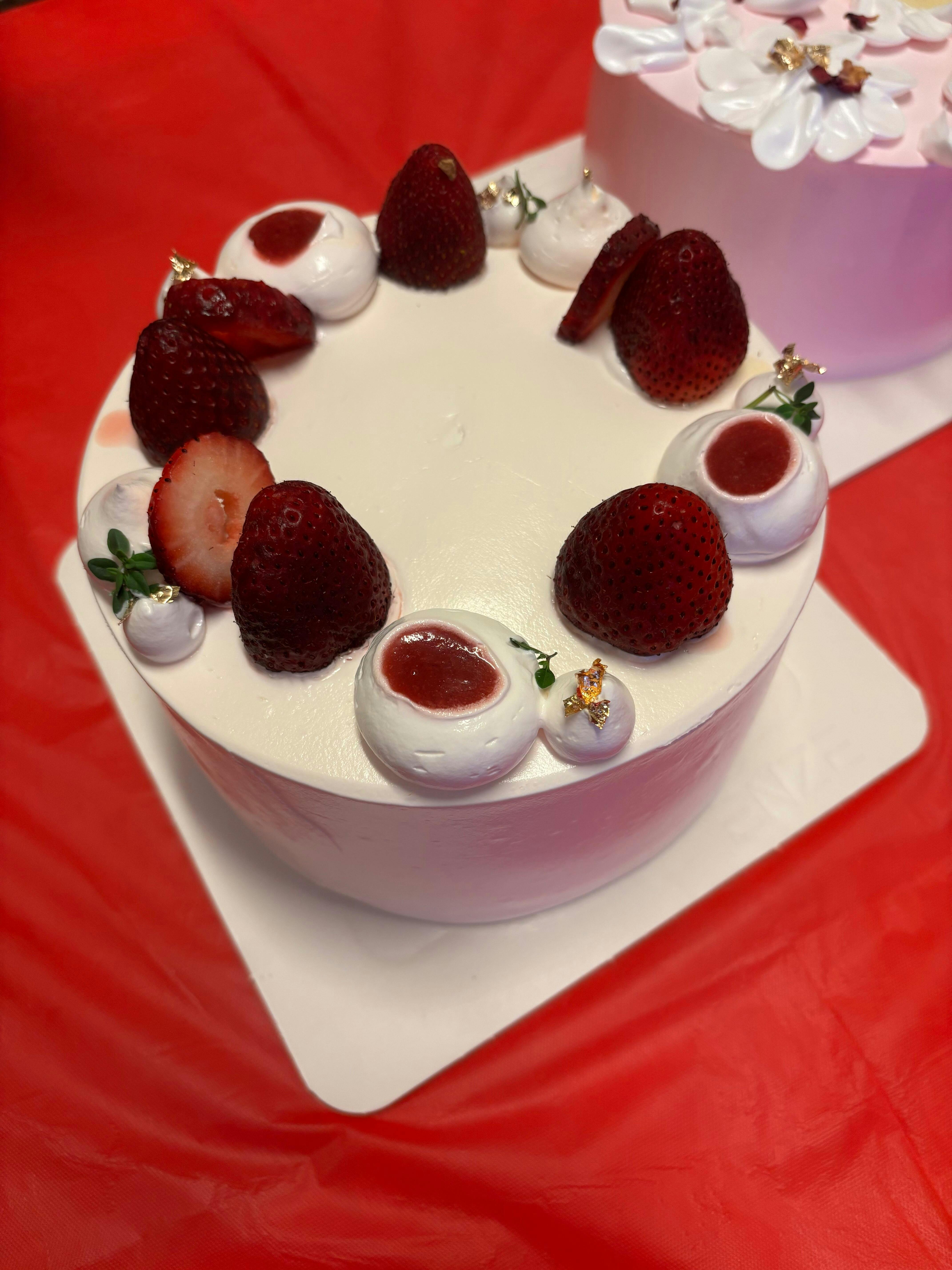Whipped fresh cream cake filled with premium, farm fresh strawberries on a fluffy cotton chiffon sponge
