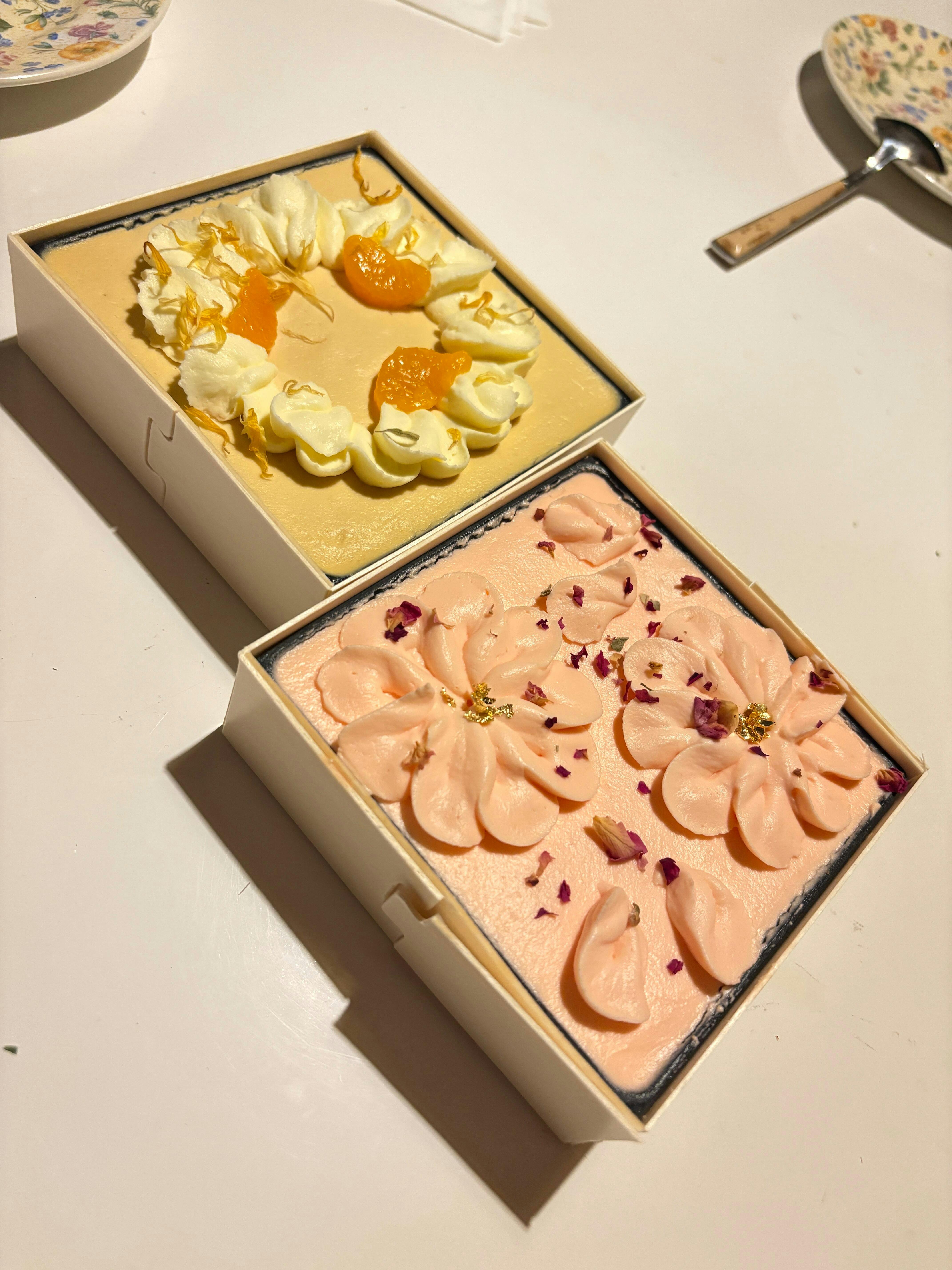 Fine imported Fujian Jasmine tea infused cream chiffon cake coupled with mandarin slices. Floral and fragrant with a subtle bitterness (tea tannins).