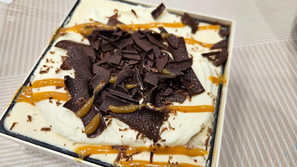 Ripened banana and toffee caramel cream topped with dark Belgian chocolate shavings